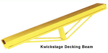 Kwickstage’s decking beams are designed with wide top flange giving more support to the plywood, and thereby reducing maintenance costs by extending the life of the plywood. The decking beams are available in 2.44, 1.83, 1.22, 0.91 and 0.61 sizes, but any special size can be constructed for a nominal charge. |